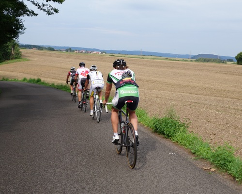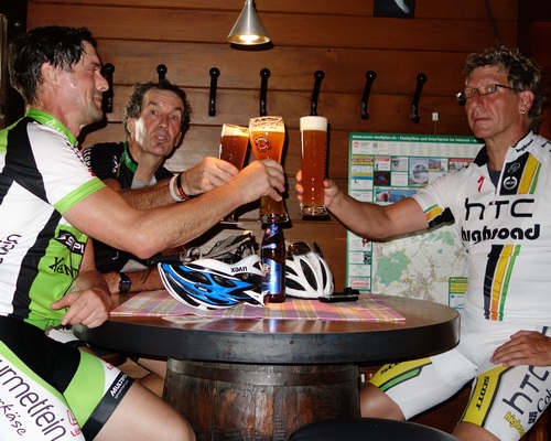 Und nun zum Radfahren. Heute Morgen ging es mal wieder gegen 9.00 Uhr los. Ihr wisst schon, zuerst der Hoxberg. In Körprich angekommen war mal wieder richtig Gedränge am Treff. Gegen 10.00 Uhr ging es los. Wir hatten einen Gast Fahrer aus Kanada. Patrice Gay ist Kanadier und seine deutsche Frau aus Schmelz. Alle Jahre besuchen sie die Eltern. Patrice und ich hatten im July 2011 zusammen mit Martin und Gerard ein Benefiz Rennen in Luxembourg bestritten. Ich habe mich gefreut ihn wieder zu sehen. Heute wurde mal wieder die Runde bis Überherrn absolviert. Das Tempo war mal wieder sehr sportlich. Quasi eine Renn Simulation. 😉 Zwischendurch kam immer wieder eine kleine Abkühlung vom Himmel. Kleine Schauer erfrischten uns in der Schwüle des Morgens. Es hatte mal wieder richtig Freude gemacht mit den Kollegen zu fahren. Es ist eine sehr homogene Gruppe. Das Fahren im Wechsel gegen den Wind klappt hervorragend. Am Ende war es ein 32,6 er Schnitt und knapp 100 Km. Das Weizenbier am Ende schmeckte wieder klasse.
