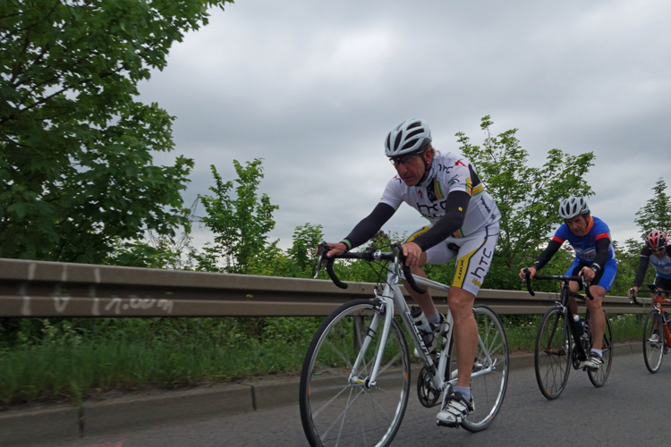 Am Montag trafen wir uns dann wieder in Körprich zum gemeinsamen Training. Wieder waren Christian und Bernd am Treff. Allerdings bekamen wir noch Verstärkung durch Peter und Joachim. Richtung Dillingen rollten wir uns moderat ein. Die Beine hatten noch keine richtige Lust, nach dem Ritt von gestern. Gut dachte ich, kann man sich etwas erholen. Schnell aus mit dem Gedanken, war es dann ab Beckingen. Peter hatte wohl gute Beine und und steigerte das Tempo immens. Mist, dachte ich, nix erholen. Wir alle mussten kräftig rein treten um an Peter dran zu bleiben. Peter erzählte, dass er die zwei Wochen vorher im Training langsamer gefahren ist und das einen guten Trainingseffekt bringt. Daher klappe es jetzt so gut. Wir schauten uns an und dachten: “Peter ist langsam gefahren?”. Nach einigen Wechsel an der Spitze, das Tempo blieb hoch, Christian, Bernd und Joachim trugen auch ihren Teil dazu bei, war ich dann wieder an der Reihe. Na gut, dachte ich, dann hole ich auch noch den Rest aus mir für heute raus, erholen kann man sich ja immer noch.